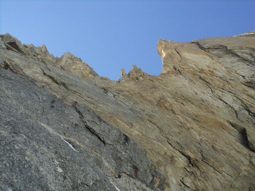 Следующая веревка прошлась, хоть местами и витиевато, но целиком свободным лазанием. Я тут не буду спекулировать, сколько там в точности было градусов, какой рельеф и т. п. Скажу так. Мы не пользовались оттяжками, и встегивали веревку через один карабин прямо в крюк или закладку. Но даже после установки 7-8 промежуточных точек веревка по-прежнему легко через них продергивалась. То есть не слишком расчлененный был рельеф. Станция опять получилась только на крючьях, в неудобном углу с небольшим пузатым откидом.