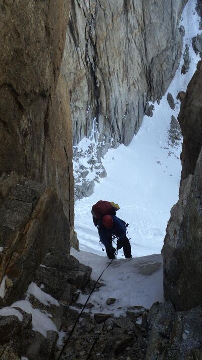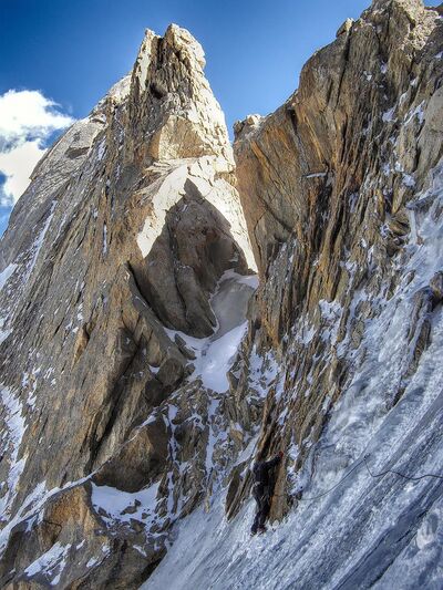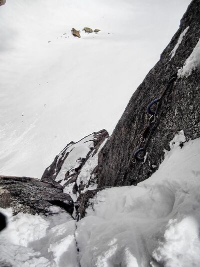 Щелей, куда закладываться, было на любой вкус. То есть со страховкой проблем не было. Собственно, и все. На всем протяжении не попалось ни одной полочки, куда можно было бы поставить больше, чем одну ногу. Удобных верхних хваталок мало. В основном широко расположенные боковые захваты, а также нижние, в щелях. Слава богу, хоть у меня руки не мерзлячие, в забитые снегом щели пальцы совать. В каком-то месте я попал во внутренний угол с гладкими стенками. В скальниках тут было бы, наверное, без проблем, а в кошках как-то совсем не фонтан. Тут я обратил внимание на узенькую щелочку на левой стенке и вспомнил, что у меня в ридикюле за плечами есть фифы. По этой щелочке я прошел вверх на фифах где-то 4 или 5 пролетов крюколесенок. Дальше снова лазанием. Потом у меня внезапно кончились карабины (?!) Раньше, чем кончились 50м веревки. Пришлось делать станцию. Подходящего надежного уступа, чтобы завязать петлю, не оказалось, станция получилась на паре крючьев. Станция была стоячая наполовину, в том смысле, что прямо стоять было можно, но только на одной ноге. Как-то неуютно... Короче, к прохождению этого безобразия я оказался морально не готов. Недооценил его. Настолько, что даже забыл, что неплохо было бы иногда фотографировать...