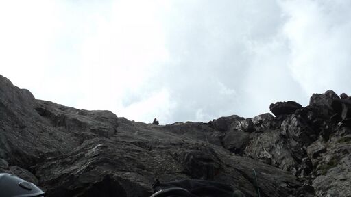 25.08: с утра погода приемлемая. Вышли в 7:50. Поднялись по навешенным 4 дня назад веревкам. На неудобный жандарм набросили лассо, сделали перила. Сразу за ним был очень необычный узкий и глубокий провал с отвесными стенками. Участникам с рюкзаками приходилось дюльферять внутрь провала на несколько метров, а затем жумарить наверх. Последний участник, чтобы снять эти неудобные перила, вернулся к жандарму без рюкзака, отвязал лассо и со страховкой преодолел провал методом могучего прыжка.