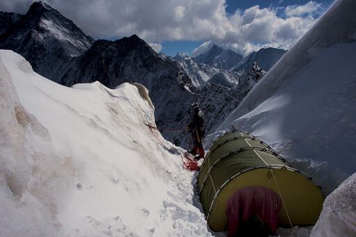К тому времени, как мы добрались до льда, до нас самих снова добрался запердон в форме бурана. Нам ничего не оставалось, как рвануть вверх, рассчитывая на то, что выше найдется какое-нибудь подходящее укрытие. По голому льду (~45 градусов) мы навесили еще 5 веревок прямо вверх, нашли там бергшрунд, пригодный для установки палатки, и тут же запурговали (N39o33.99089', O70o14.96798', H4320). Остановились в 18:30, за час до темноты, но легли поздно, т.к. понадобились некоторые строительные работы.