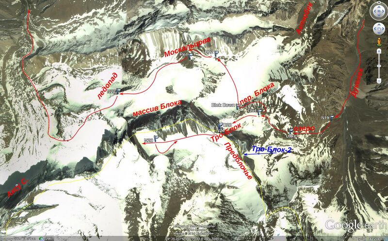 Гуглоснимок окрестностей пика Блока. Флажками помечены некоторые GPS-точки, имена которых упоминаются ниже по тексту.