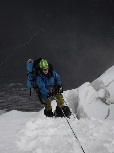 26.08: всю ночь мело, утро тоже не сулило устойчивой погоды. Ветер, поземка, тенденции сомнительны. Там, где мы ночевали, можно было пурговать и дальше, а что ждет наверху, было непонятно. Но так или иначе, все равно надо было куда-то идти, причем вверх явно ближе. Так что мы решили сначала сделать без рюкзаков разведочный выход, а заодно навесить имеющиеся веревки. С 9:30 до 12:30 мы предпровесили свои 4 веревки, наскоро пообедали и в 13:00 вышли. Этих четырех веревок (голый лед ~45 градусов) как раз хватило, чтобы подняться на водораздельный отрог, выйдя тем самым на пройденный группой Ручьева в 2013г. путь с пер. Звездный. Участок подъема оказался несложным, встречающиеся бергшрунды (некоторые широкие) преодолевались по надежным ледовым мостам.