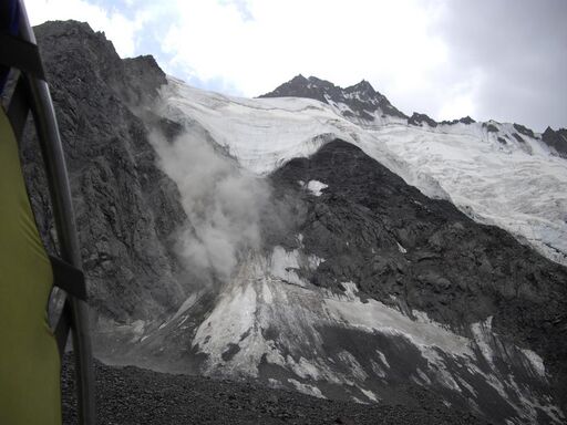 7.09: последний день похода. Вышли в 8:00. За ночь насыпало порядком снега, но нам было уже поровну, мы ломились вниз, к вечеру надо было позарез прийти в кишлак. За ходку пересекли левую ветвь ледопада и вышли на ригель - место верхних стоянок под пиком Блока. Отсюда можно идти вниз правее ригеля вдоль левого борта ледопада, но удобнее - левее ригеля спуститься прямо на ледник Аксу. За следующую ходку мы прошли этот ледник в верхнем цирке Аксу и спустились с него до тропы по правой боковой морене. В 12:20 остановились на обед у кошей поблизости от слияния Аксу и Карасу (N39o38.28571', O70o03.34323', H2898). Немного отдохнули и посушились.