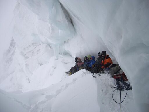 Уже когда мы жумарили по третьей веревке под бергшрунд перед полкой, прямо на нас села туча. Снегопад, видимость где-то на полверевки. По инерции руководитель успел повесить еще четвертую веревку, вышел на верхнюю полку, но в тумане совершенно не было видно, что делать дальше. Было подозрение (которое потом подтвердилось), что эту веревку навесили в неверном направлении, гораздо левее, чем надо. Мы не стали подниматься по этой верхней веревке, а уселись всей группой под козырьком бергшрунда в надежде переждать это идиотское облако и продолжить. Время 12:30.
