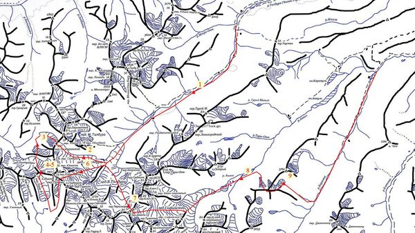 | 1.05 | 3 | лед. Большая Талдура – пер. Талдуринский (1Б, 3349) – лед. №170 – левый борт долины р. Оштуайры | 7 | +570 -580 |