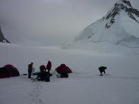Дальше начался крутой снежно-ледовый склон, и в итоге до пологого участка понадобилось повесить пять веревок. Завершив спуск около 13-00, пообедали и в связках пошли к леднику Федченко, тропя неглубокий (по щиколотку) снег. Хоть снег и неглубок, а ледник ровен, но ведущего приходится регулярно менять – сказывается высота и увесистые рюкзаки. На ночевку останавливаемся около 18-00 на высоте 5200 м. Солнца не было видно весь день. За ужином Марина наконец-то угостила нас припасенным «сюрпризом». Это оказался тюбик с майонезом! Нетривиальное решение, с восторгом принятое коллективом.