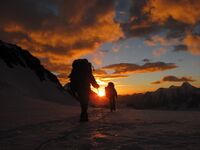 Вышли в 7-50. Необыкновенно красивый рассвет. Как в песенке 70-х: «оранжевое солнце, оранжевое небо…» (рис. 4.70). Заход на перевал Зимовщиков (2Б, 5915 м), технически прост. Ледник закрытый, идем в связках, снег держит хорошо. Поднялись на седловину около 12-ти, сняли записку знакомой группы МГУ. Спуск с седловины и начало движения по леднику Витковского также не вызывают вопросов. Идешь, как по проспекту, придерживаясь правого борта.