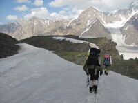Примерно за километр до слияния Федченко и ледника Е. Розмирович начались широкие трещины. Уходим к левому борту и связываемся. Довольно неприятный отрезок пути: снежные мосты плохо держат, в поисках безопасного варианта приходится то забираться на моренный гребень, то спускаться на ледник. Впрочем, продолжалось это лишь около часа. К 18-00 оказываемся на ровной части ледника. ГМС кажется уже совсем близкой, поэтому последняя ходка до нее оказывается полуторачасовой.
