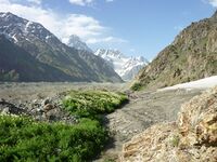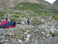Выше по склону слева по ходу видны полочки, поросшие сочной травой, но памятной по 2004 г. поляны с озерцом для ночевки найти не удалось. Судя по всему, зима была очень снежной и сошедшие лавины затерли карманы левой морены РГО. На одном таком растаявшем лавинном выносе, на высоте 3600м, в 4.5 км от моста через Абдукагор мы и встали на ночевку.