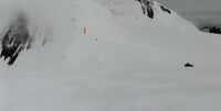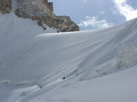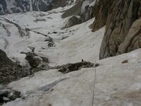 От него две веревки были повешены по снегу на щите и ледорубе, под бергшрунд, где имелась полка, достаточно вместительная для сбора группы. Здесь нас накрыло облако и видимость пропала минут на сорок.