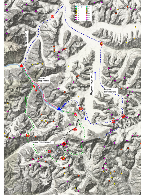 Рис. 1.5.2.. Нитка маршрута. Старт и финиш – красный треугольник. Синий треугольник – место дневки. Красный пунктир – занос заброски. Зеленый пунктир – запланированный маршрут первого кольца. Голубой пунктир – запланированный маршрут второго кольца. Черные точки – произошедшие изменения маршрута. Кружками обведены пройденные перевалы.