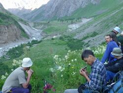 Рис. 4.80. Обед на морене ледника Федченко. Фото в сторону верховий ледника.