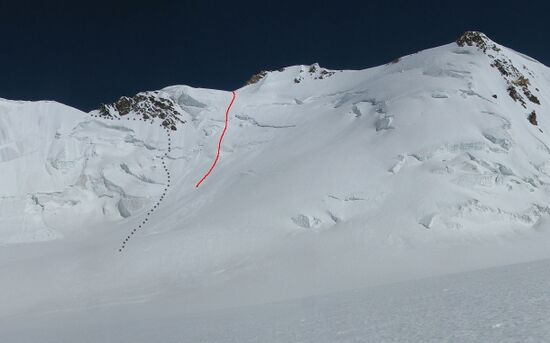 Рис. 6.3. Красная линия – обсуждавшийся вариант подъема. Черный пунктир – реально пройденный маршрут. Фото Г. Сальникова.