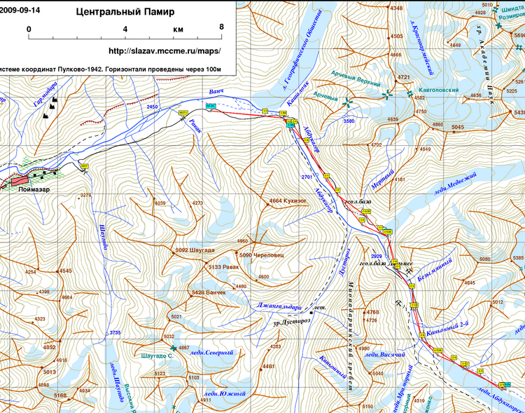 Около половины участников группы имели ограниченный высотный опыт, но были достаточно хорошо подготовлены технически и физически. Пройденный маршрут должен был существенно повысить их спортивную квалификацию. Район п. Революции – одно из красивейших мест Памира, где не довелось до сих пор побывать обоим руководителям похода. Здесь находится крупнейший долинный ледник мира, а также легендарная ГМС им. Горбунова, каждое посещение которой остается в памяти на всю жизнь. При планировании похода рассматривался вариант заезда с юга, по р. Бартанг, однако собранная в Сети информация заставила задуматься о надежности такого варианта. Мы побоялись разливов Бартанга в июле, сопровождающихся разрушением дороги вдоль реки и отдали предпочтение более надежному северному варианту заезда, через Ванч и Поймазар (рис. 2.1).