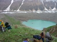 Снег на леднике Федченко держит заметно лучше, но под ногами все равно хлюпает, поэтому продвинувшись на две ходки встаем на ночевку около 16-30 на берегу красивого озерца (рис. 4.77). И вновь нашлись желающие в нем искупаться!
