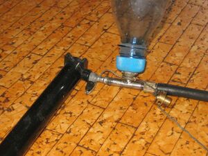 К ней привинчен справа шланг к горелке, а слева насажен велонасос. Бутылку
