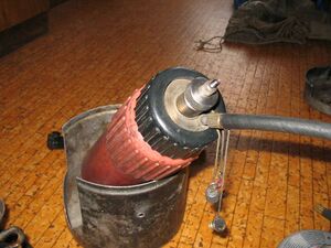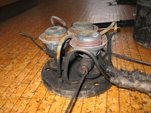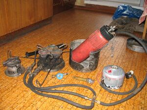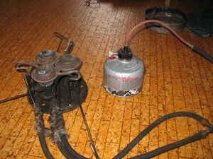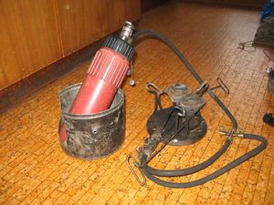 Справа от бензинового бака - газовый баллон (эпигаз) и рядом с ним насадка с вентилем (от карлинеровской газовой горелки) и шлангом. Имеется возможность завести в горын сначала газ, дать ему одну минуту горения (за это время головы прогреются), потом отсоединить газ, присоединить бензин (замена происходит быстро, головы не остывают за это время), и работать дальше на бензине, не кочегаря бензин отдельно для прогрева. Если использовать газ не предполагается, этот комплект не берут.