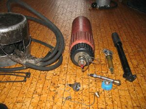 Справа - красный бензиновый баллон (сделан из автомобильного огнетушителя) с ниппелем под велонасос, колпачок ниппеля открыт, болтается на ниточке. Баллон стоит в стандартной банке от Шмеля-2, которая используется для укладки горына в походное положение.
