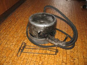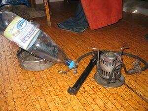 Сзади горелки лежит черный велосипедный насос, которым накачивают давление.