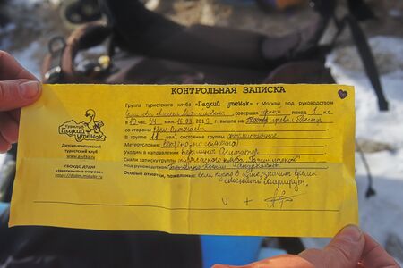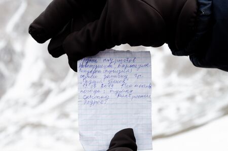 Записка на этот раз находится. Она написана от руки, датируется 2019 годом и оставлена здесь группой туристов из Барнаула, Новокузнецка и Киргизии. Написанное повествует, что в августе 2019 года здесь был снегопад.