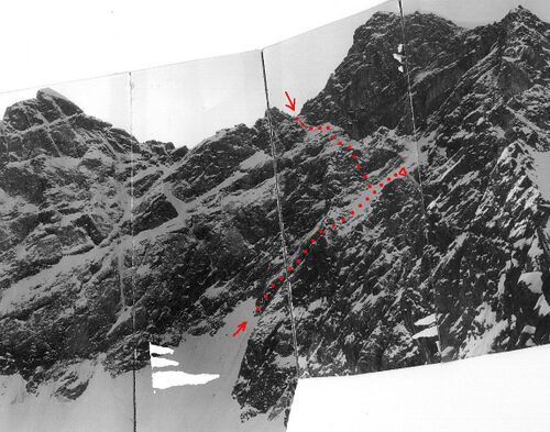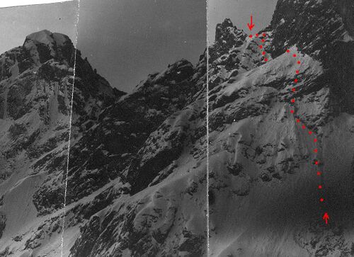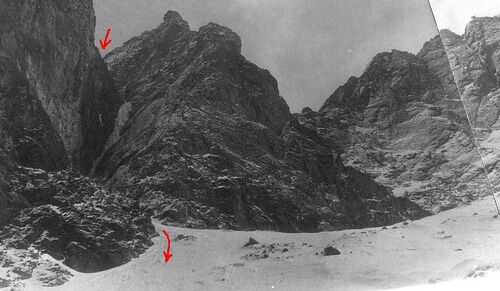 Вид со стороны Арчалытора практически из-под перевала. Мы спускались, где показано, все время по кулуару. Зимой все вмерзшее, камнеопасность незначительная. Летом по кулуару идти нельзя. Надо правее кулуара (как смотришь) по контрфорсу. Нечаев так и поднимался. Низ крутой, верх положе, но без веревки нельзя нигде. В нижней части кулуара видна сосулька - это и есть сброс 60 м, про кот. я упоминал.
