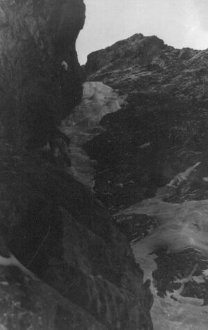Это продолжение подъема: на заснеженном галстуке за углом. Кажется, третья веревка, начало навески четвертой. Дальше - в левый верхний угол кадра, там надо было пройти по щели между скалами, а дальше стенка опять расширялась. Все, что есть по технической работе. Выше путь стал гораздо сложнее, нам там было уже не до фотографирования.