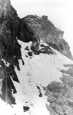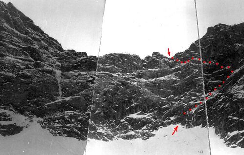 Это со стороны Онтора. Первая веревка. Косой подъем по заснеженным скалам. За углом - налево, там еще был такой заснеженный галстук, по нему дальше вверх.