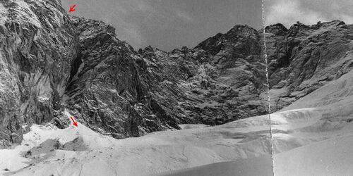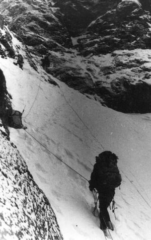 Вот еще слайд. Если присмотреться, за провалом, справа под стенкой, видны следы в конце полочки, где ползли на пузе. Там видна веревка и человек, который пытается сообразить, как здесь можно организовать перильную станцию. Здесь снято снизу вверх, от того стенка кажется пологой, на самом деле она там крутая. Проблема в том, что, во-первых, скальная стенка вся залеплена снежными шапками, и рельеф, чтобы забить крюк, надо еще найти под снегом. А во-вторых, надо еще сообразить, что можно сюда забить, потому что у человека на скале как раз закончились крючья. К счастью, удалось повесить перила на заклиненный в отщепе ледоруб. Дальше отсюда уходили полутраверсом влево к перемычке, примерно полверевки.