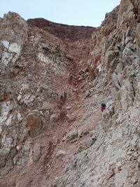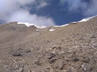 12.08. В этот день предстоял ключевой участок скальных жандармов. Планировали обойти их по льду, однако план поменяли. Обход по льду предполагал либо длинный траверс по ледовому склону, либо подъем по гребню, потом спуск по льду и снова подъем по склону (зигзагообразный путь). В общем трудоемко. Помимо этого, увидели, что со скал падают камни и летят по ледовому склону с бешеной скоростью. Решили попытать счастья на скалах. Скалы оказались совершенно гнилыми. Огромные камни вываливались при попытке подержаться за них. Навесили меньше веревки перил по скалам. К счастью, дальше смогли обойти жандармы и нашли проход по осыпному кулуару бордового цвета. В кулуаре из-под ног все летит вниз. Проходили участками, двигаясь его поочерёдно. Снова вышли на гребень, ура! Далее гребень поворачивает и становится снежно ледовым. Проходили его попеременным движением, страхуясь на бурах. Один раз повесили перила (был короткий, но крутой взлет). Вскоре перешли с попеременного движение на одновременное, продолжая крутить буры. Еще через некоторое время гребень стал широким и не крутым. Тогда пошли в связке без дополнительных точек страховки. Примерно в 16 часов достигли высоты 5400 м. Перед нами был пупырь, периодически его скрывало облако. Вокруг ходили тучи, иногда гремел гром. Решили на пупырь в этот день не лезть. До вершины осталось 450 м по вертикали.
