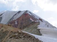 13.08. Утром налегке отправились на вершину. В 7 утра видели ледовый обвал на перевале Красина (в районе полки посередине, упало со склонов пика Красина). Зашли на пупырь и оказались перед взлетом на вершину. Прошли его в связке, в 9:30 были на вершине. Пофотались, пообнимались, съели что-то и пошли назад. Добрались до лагеря, попили чай, собрались и стали спускаться. Вниз по уже известному гребню прошли быстрее и увереннее. На ключевом участке после бордового кулуара хотели обойти скальный участок по сыпухам, чтобы не вешать перила. Не вышло, сыпухи были очень неудобными на спуск. Пришлось дюльферять. Чистого восхождения не получилось - вынуждены были оставить на скалах кусок расходняка. Спускались очень аккуратно, чтобы веревкой не накидать на себя камней. Артем сдергивал веревку, прячась за скалами. Длинная (60 м) веревка оказалась кстати. Половины ее ровно хватило, чтобы спуститься с крутого участка. Дальше пошли на три такта по ледовой части гребня. Вскоре крутой ледовый участок закончился. Дальше спускались по осыпной части гребня. К вечеру достигли подножия горы 3950 м.