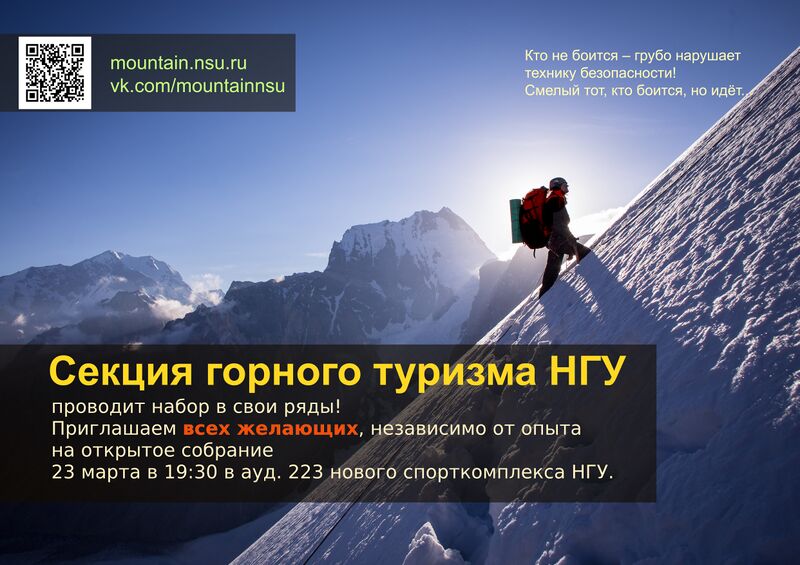 Собрание посвящено набору новичков в секцию. Приглашаем всех, кто хочет вступить в стройные ряды горных туристов. Мы расскажем вам про горный туризм, про секцию и что нужно, чтобы пойти с нами в горы. Собрание пройдет в новом спорткомплексе (ул. Пирогова 12/1), ауд. 223. Начало в 19:30.