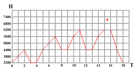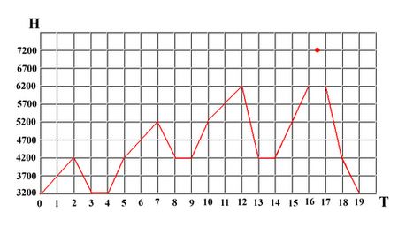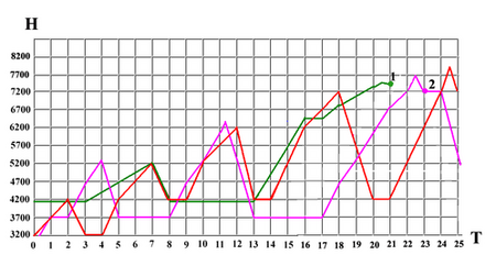 А теперь построим высотный график восхождения для команды альпинистов, приехавших на высоту 3200 и отдыхающих в базовом лагере на высоте 4200. При построении графика мы не будем учитывать ограничения со стороны рельефа и добавим на восстановление лишь по одному дню отдыха между выходами (это совсем не много).