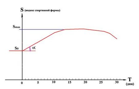 Максимальное значение Smax зависит не только от уровня S0 спортивной формы в начале мероприятия, но и от угла альфа, который характеризует скорость её роста в первые недели нахождения в горах. Иначе говоря, в горах вы невольно продолжаете тренироваться, просто выполняя намеченную горную программу, и ваша способность переносить физические нагрузки растет.