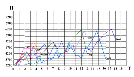 Высотным графиком принято называть линию, отражающую жизнь индивидуума или группы в горах, которая прорисована в осях T [время] и H [высота]. Так вот, высотный график при ступенчатой акклиматизации имеет пилообразную форму. Каждый зуб мы будем называть выходом в высокогорье, а впадины между зубцами - интервалами восстановления. Чем ниже высота интервалов восстановления, тем лучше. На высотах выше 5000 метров восстановления организма практически не происходит.