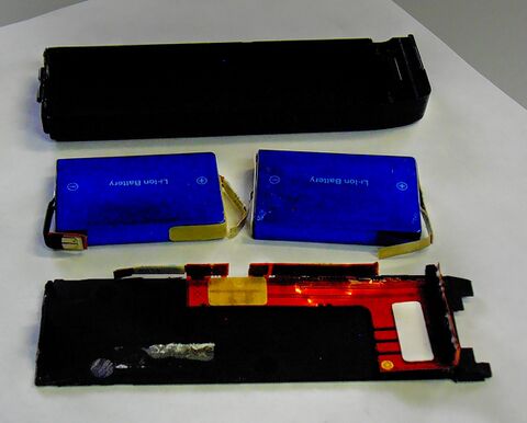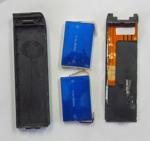 На этой картинке изображена уже восстановленная батарея. Сдохла она необратимо. Вздутые аккумуляторы вспучили корпус батареи так, что аж тонкая пластмаска корпуса треснула. Батарею надо аккуратно вскрыть, оттянув с помощью тоненькой отверточки длинные боковины от защелок. Особенно аккуратно вскрывать с внешнего бока - там внутри находится длинная платка защиты (на картинке местонахождение платки показано стрелками). Сняв крышку корпуса, можно обнаружить внутри упомянутую платку и пару самих аккумуляторов. Платка простая, без "мозгов". Аккумуляторы тоже самые что ни на есть обыкновенные, на 3.6В, такие же, как в некоторых мобильниках.
