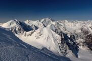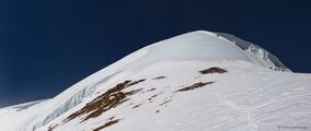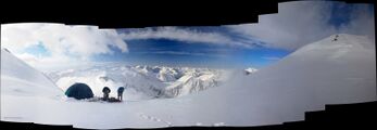 Просыпаемся в 5.00, выходим в 6.40. Альпинисты вышли раньше нас минут на 40, поэтому идём по их следам. Впрочем тропёжки никакой и не случилось - по смёрзшимуся снегу совсем не проваливается. Практически сразу связываемся и практически больше не развязываемся до этого же места. За 3 ходки доходим до поворота на наш кулуар, где, чуть приподнявшись, надеваем кошки. За 2 ходки вылезаем на гребень. За ходку подходим к жандарму, за которым наблюдаем группу альпинистов, собирающихся штурмовать "серп". Решаем подождать пока они освободят гору, устраиваем тут обед. Во время обеда погода портится - поднимается ветер, падает видимость. Серп заснежен, поэтому двигаемся в связках. На вершину выходим к 14.00. Не видно ничего. Фотографируемся с треногой и валим. За 20 минут доходим до перевала пути 2а - только благодаря тому, что этот путь я отлично знаю. Вообще говоря, при данной видимости (в 20 метров) передвижение по этому гребню крайне затруднительно и опасно. По-хорошему, было бы неплохо ещё пройти по гребню в сторону пика Квадратный, но видимость и ветер не позволяют. В итоге аккуратно ставим лагерь прямо на перевале, окапываемся. Не спеша ужинаем и устраиваем ранний отбой. Высота 3980м, но все чувствуют себя хорошо.