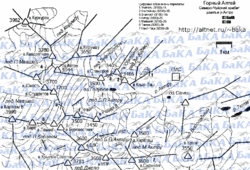 1 - Актру, 3 - вершина Квадратная, 5 - Куркурек, 2,4 - узловые вершины. (фото взято тут)
