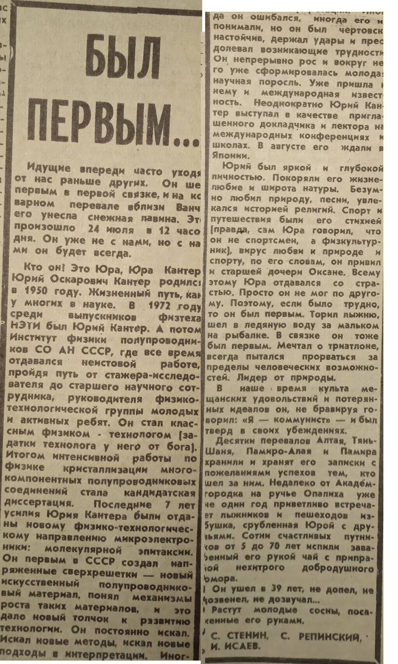 Вырезка из газеты после гибели Юрия
