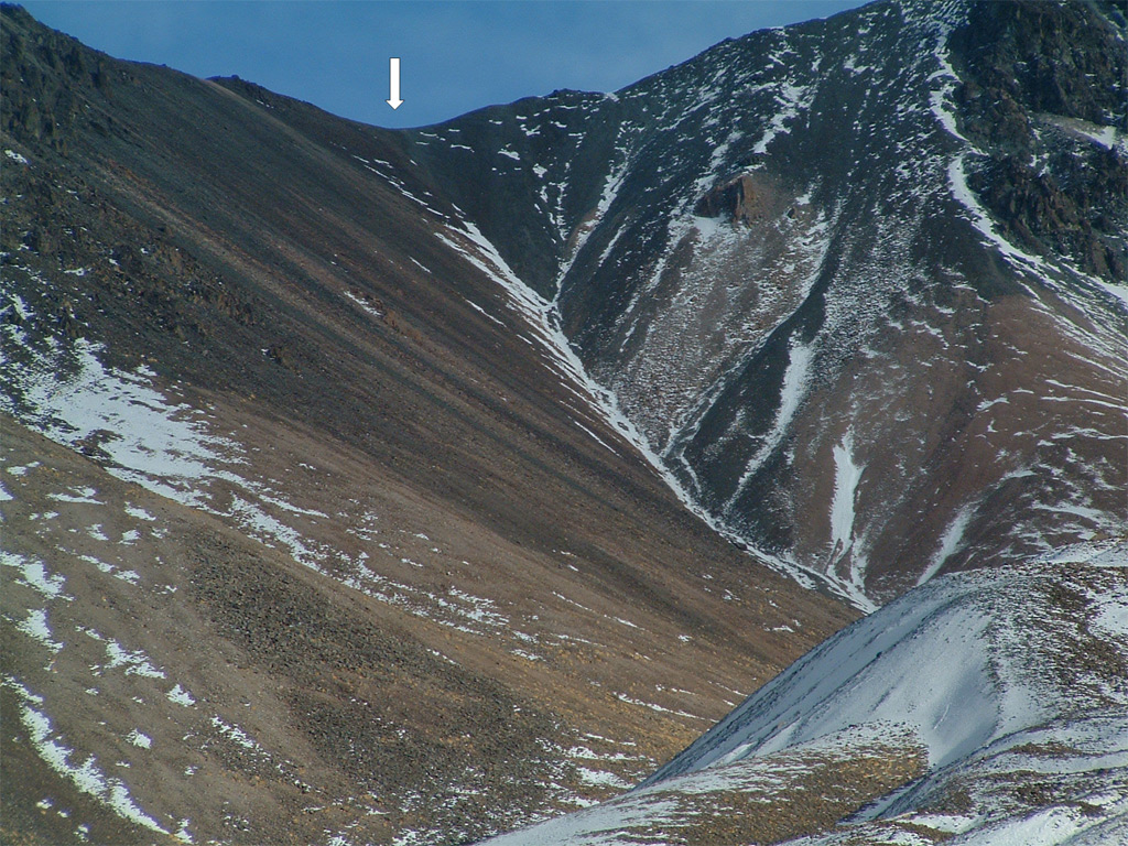 Фото 11. Взлет на перевал Майда-Адыр. Вид из долины Джеламыш. Стрелкой отмечена седловина. Фото Ульянова Александра.