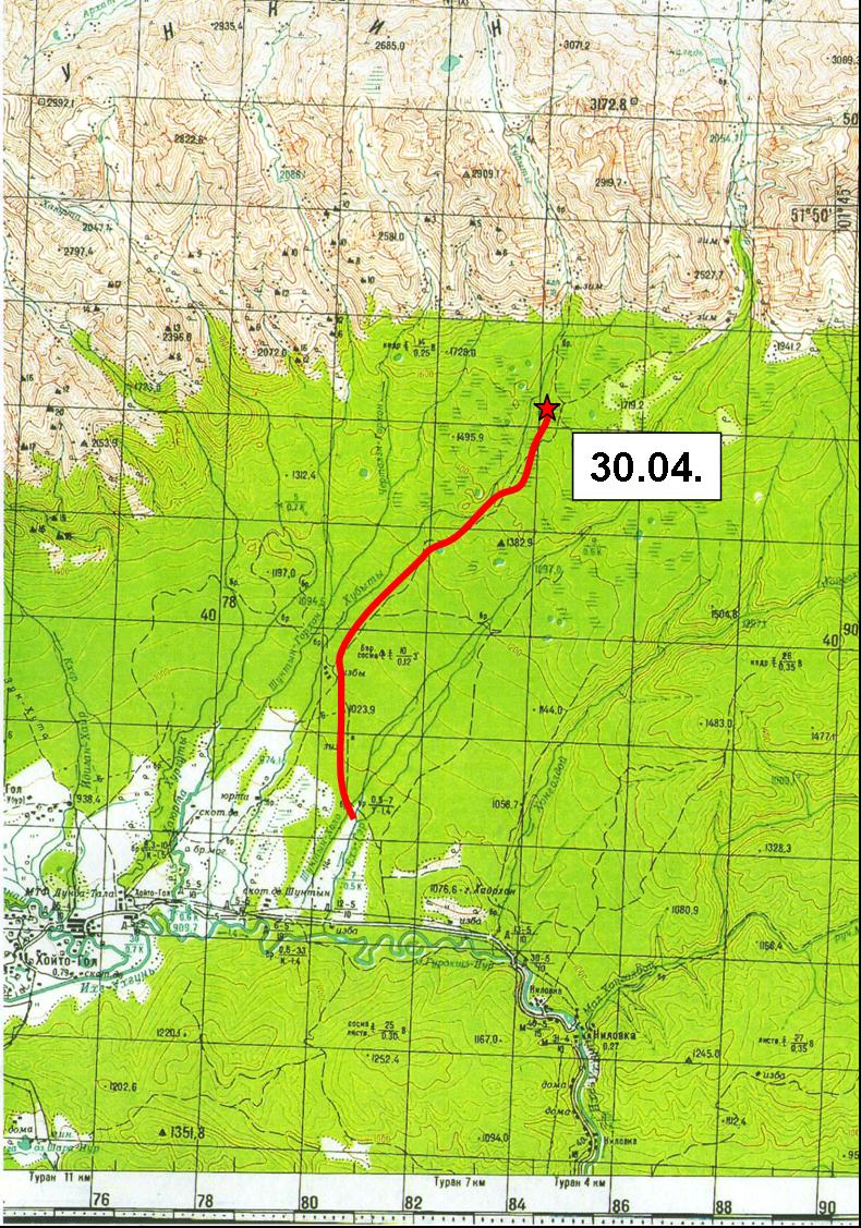 Горная 1ка Жимулева на Восточный Саян весна 2009. Карта с путем пройденым в первый ходовой день.