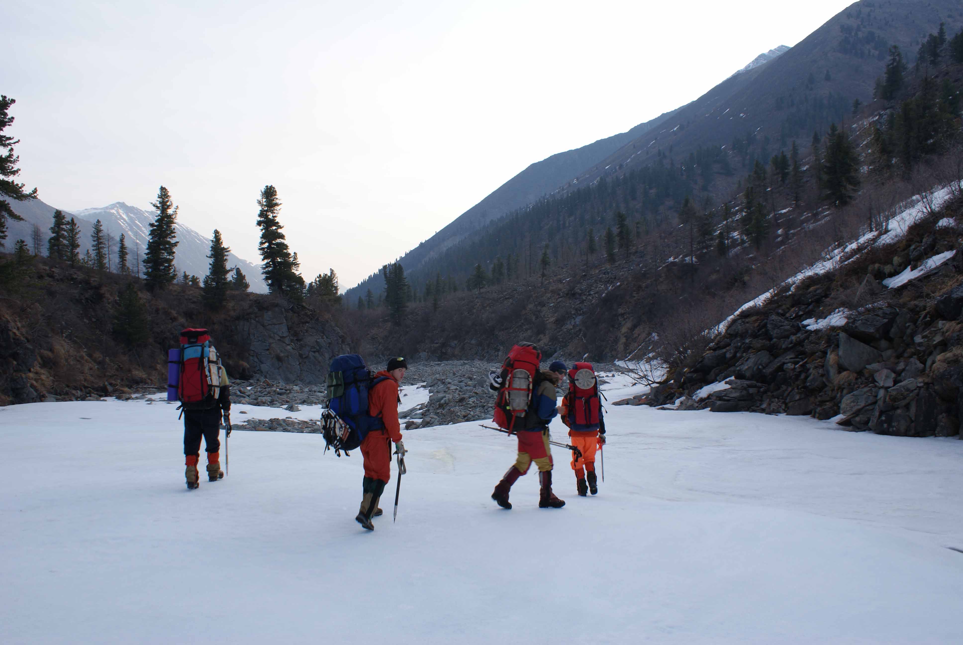 Горная 1ка Жимулева на Восточный Саян весна 2009. Группа движется по наледи на р. Левый Шумак по направлению к минеральным источникам.
