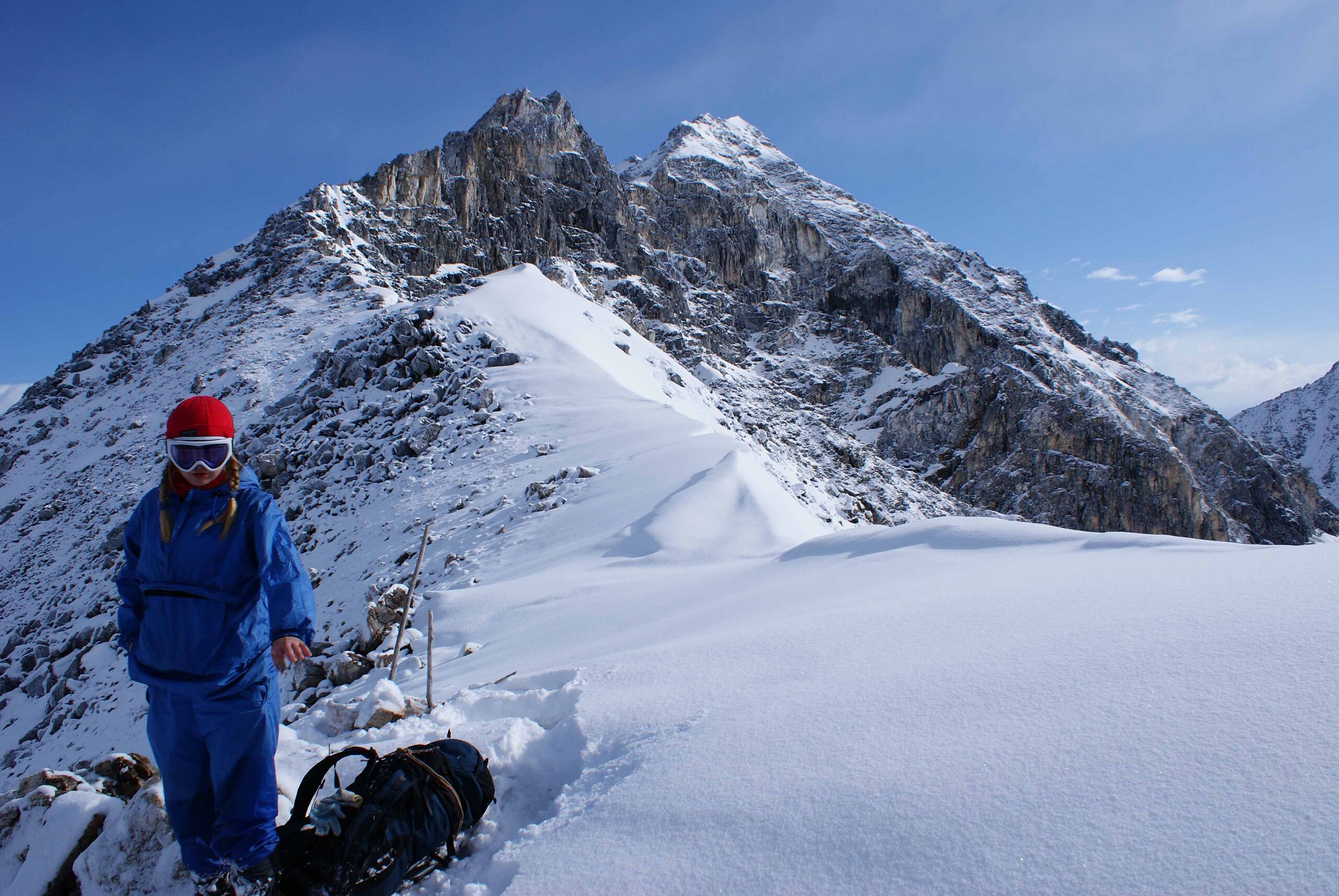 Горная 1ка Жимулева на Восточный Саян весна 2009. Оксана на седловине перевала Ветреный. Вид на север. На заднем плане пик Мраморный. Справа видны снежные карнизы.