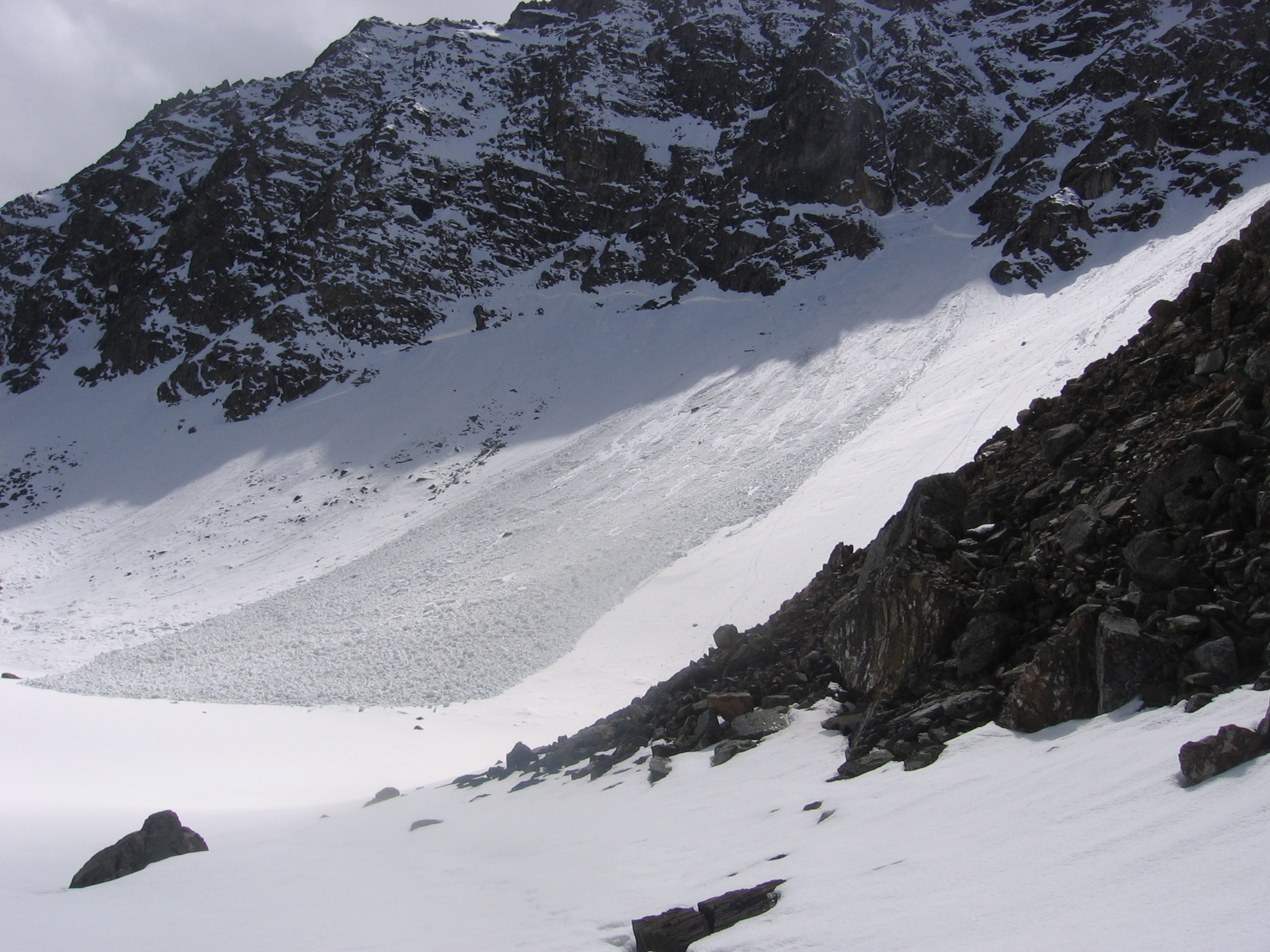 Горная 1ка Жимулева на Восточный Саян весна 2009. Сошедшая лавина. Берег озера под перевалом Ветреным.