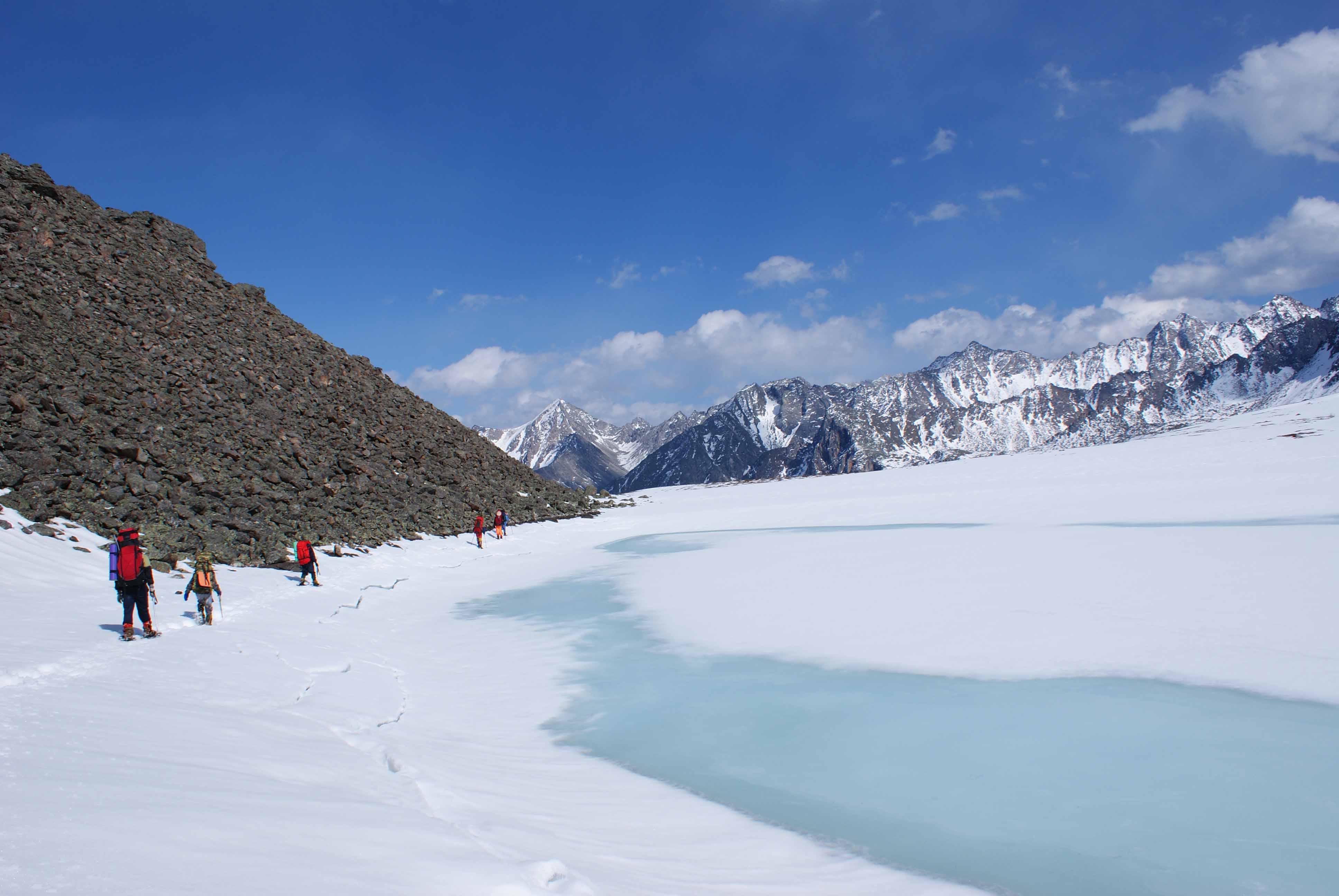 Горная 1ка Жимулева на Восточный Саян весна 2009. Группа движется по берегу озера в долине р. Правой Билюты.