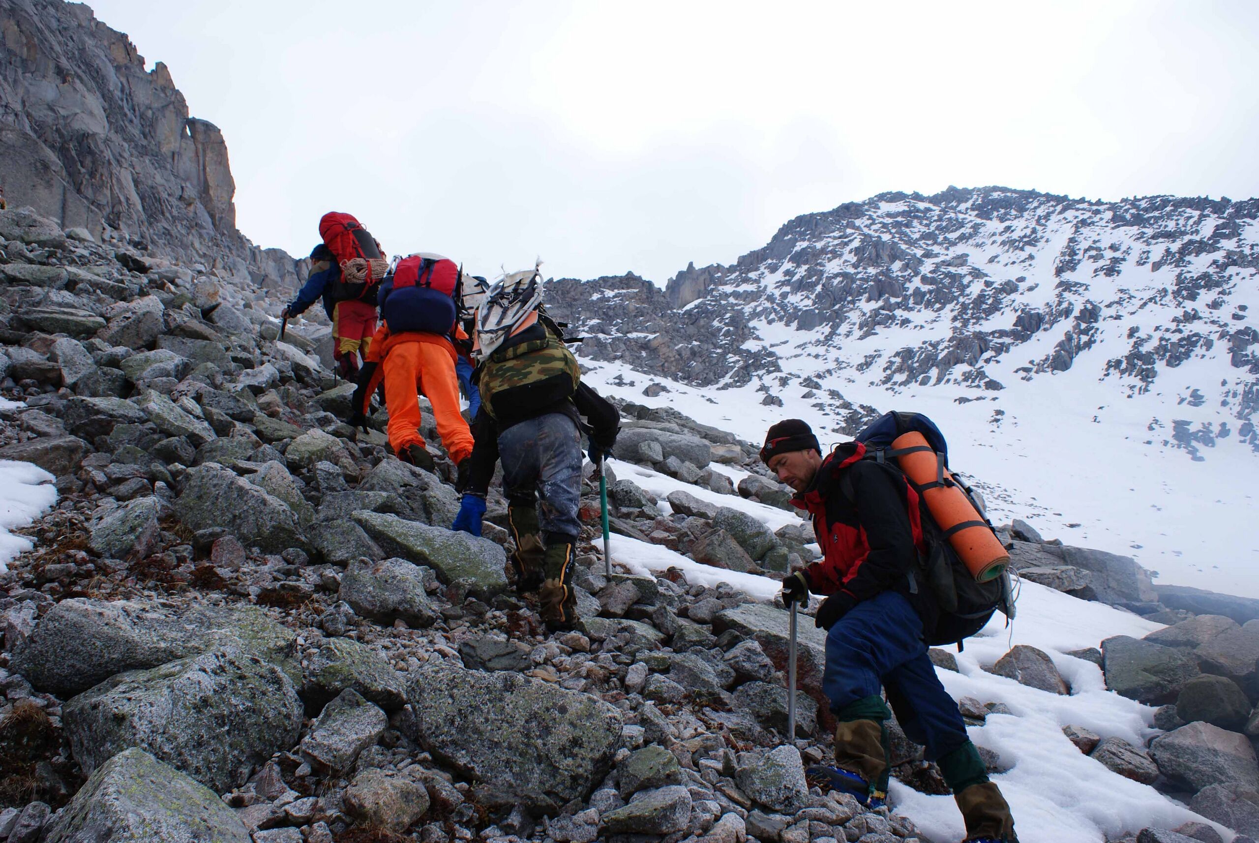 Горная 1ка Жимулева на Восточный Саян весна 2009. Группа поднимается на перевал Бепкан по малоподвижному участку осыпи.